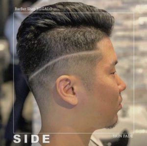 右側サイド部分はスキンフェード (2mm以下で刈り上げたスタイル)になっていて